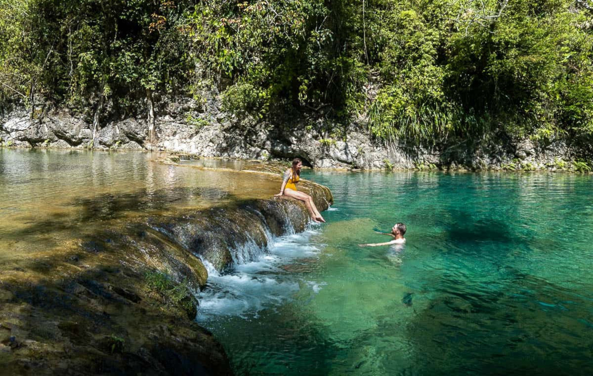 Semuc Champey, con su puente natural de piedra caliza, pozas turquesas, cuevas y mirador, es uno de los mejores lugares para visitar en Guatemala. Un fenómeno natural impresionante.